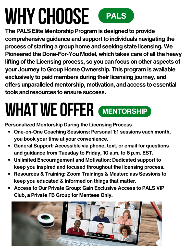 Starting a shared living/group home business demands both expertise and a compassionate, thorough approach. At PALS Agency, we begin with a detailed Discovery consultation to understand your vision and goals, tailoring our support to your unique needs. Our mission is to empower you to create a thriving, compassionate living environment for those in need. We provide comprehensive A to Z assistance, guiding you through every step of establishing and managing a successful shared living/group home venture, whether licensed or unlicensed. Embark on this journey with confidence, knowing that PALS Agency offers unwavering support from start to finish.