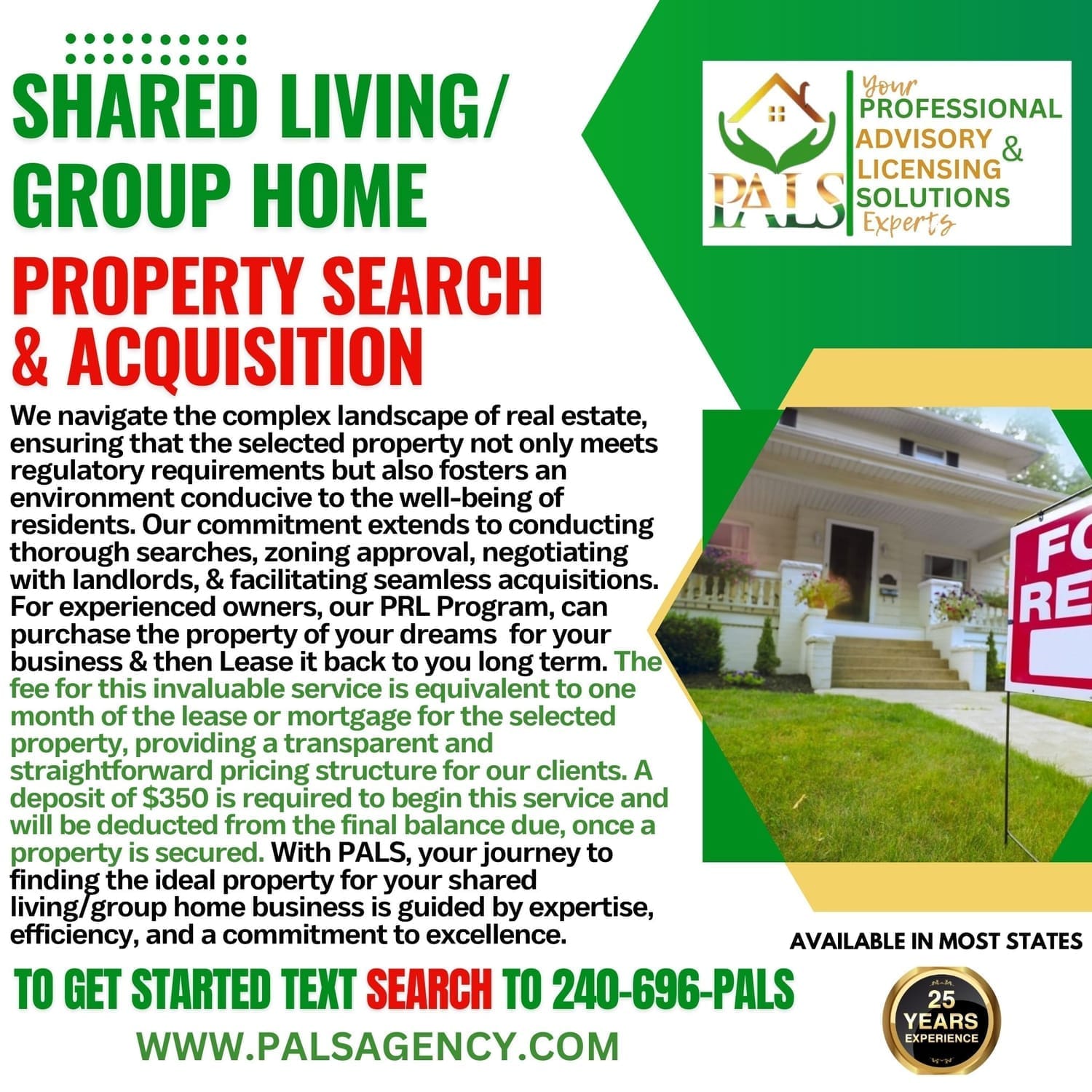 Ensuring you have the right home in the right place to meet your specific service needs is critical. Navigating the complexities of property acquisition for service-oriented businesses requires expertise and diligence. Our expert team at PALS Agency assists in finding properties that align with your mission and service requirements, considering accessibility, state building requirements, community resources, and zoning regulations.