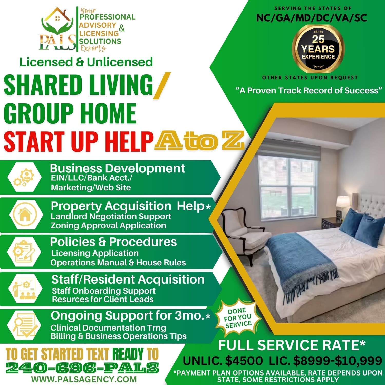 Starting a shared living/group home business demands both expertise and a compassionate, thorough approach. At PALS Agency, we begin with a detailed Discovery consultation to understand your vision and goals, tailoring our support to your unique needs. Our mission is to empower you to create a thriving, compassionate living environment for those in need. We provide comprehensive A to Z assistance, guiding you through every step of establishing and managing a successful shared living/group home venture, whether licensed or unlicensed. Embark on this journey with confidence, knowing that PALS Agency offers unwavering support from start to finish.